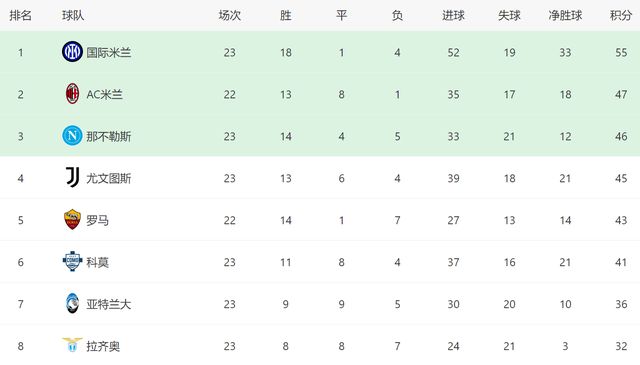 截至目前,国米在意甲已经一骑绝尘了。23轮过后,国米足足拿到55分,他们如今领先第二名的AC米兰8分之多。哪怕接下来AC米兰能够在客场战胜博洛尼亚,他们也没有机会威胁国米的位置。从目前来看,意甲争冠已经几乎没有悬念了,就国米虐菜的稳定性,他们夺冠只剩下时间问题了。