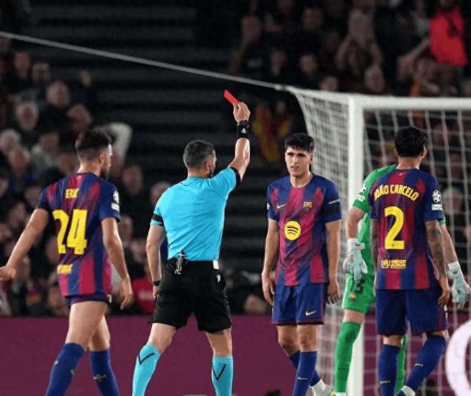 这就是欧冠的残酷。第42分钟,小西蒙尼形成单刀,库巴西身后犯规。裁判先是黄牌,VAR介入后直接改红牌。19岁的巴萨后防核心就这样结束了比赛。他成为欧冠历史上首位20岁前两次被罚下的球员,上次是对本菲卡,这次是在诺坎普。