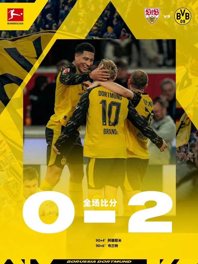 北京时间4月5日凌晨0点30分,斯图加特坐镇主场迎战多特蒙德。上半场比赛,施蒂勒、菲里希射门造险,科贝尔力保球门不失,半场双方均无建树。易边再战,双方有威胁进攻不多,补时阶段,阿德耶米门前推射破门,布兰特爆射再下一城。最终,多特蒙德客场2比0险胜斯图加特,豪取德甲4连胜。