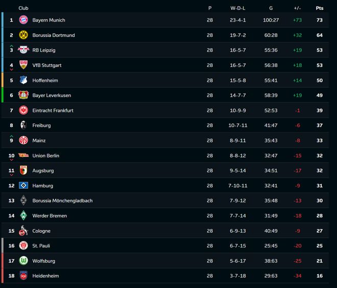 北京时间4月6日凌晨,德甲第28轮九场比赛全部结束。凭借比朔夫、卡尔补时连进2球,拜仁让二追三击败弗赖堡,同时本赛季联赛进球也达到百球大关;多特蒙德客场2比0笑傲与斯图加特的强强对话,与拜仁的分差依然维持在9分,而输球的斯图加特则是被本轮2比1击退云达不莱梅的莱比锡反超排名;联赛第五的霍芬海姆主场1比2负于美因茨,身后的勒沃库森趁势以一场6比3狼堡的大胜将分差缩小至1分。